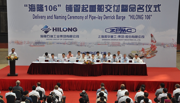 海隆集團董事長張軍、執(zhí)行總裁汪濤、振華重工常務(wù)副總裁戴文凱、劉建波等兩家公司的高層領(lǐng)導,以及來自中海油、中石化、美國船級社、中國船級社、航道局、上海市寶山工業(yè)園區(qū)等公司和單位的代表出席了此次交船暨命名儀式。