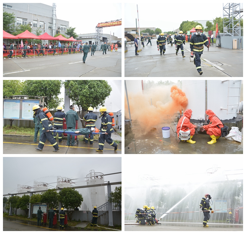 此次演練預(yù)設(shè)場景為海隆廠區(qū)甲類液體儲罐管道發(fā)生泄露,由于搶修不慎造成火災(zāi),火勢逐漸擴(kuò)大、失去控制,同時有人員受傷,應(yīng)急預(yù)案隨之展開。疏散警戒組、物資保障組、通信聯(lián)絡(luò)組、設(shè)備保障組、環(huán)境偵檢組依次到場;消防和醫(yī)療人員展開滅火、被困人員解救和傷員救治工作,同步組織實(shí)施堵漏。由于現(xiàn)場火勢逐漸增強(qiáng),消防撲救組請求政府救援力量處置,隨后寶山區(qū)110、119加大力量趕赴現(xiàn)場救援,共同將火勢控制下來。整個演練時間約15分鐘,演練流程順暢,環(huán)節(jié)緊湊,各小組表現(xiàn)優(yōu)異,圓滿完成了各項(xiàng)演練任務(wù)。